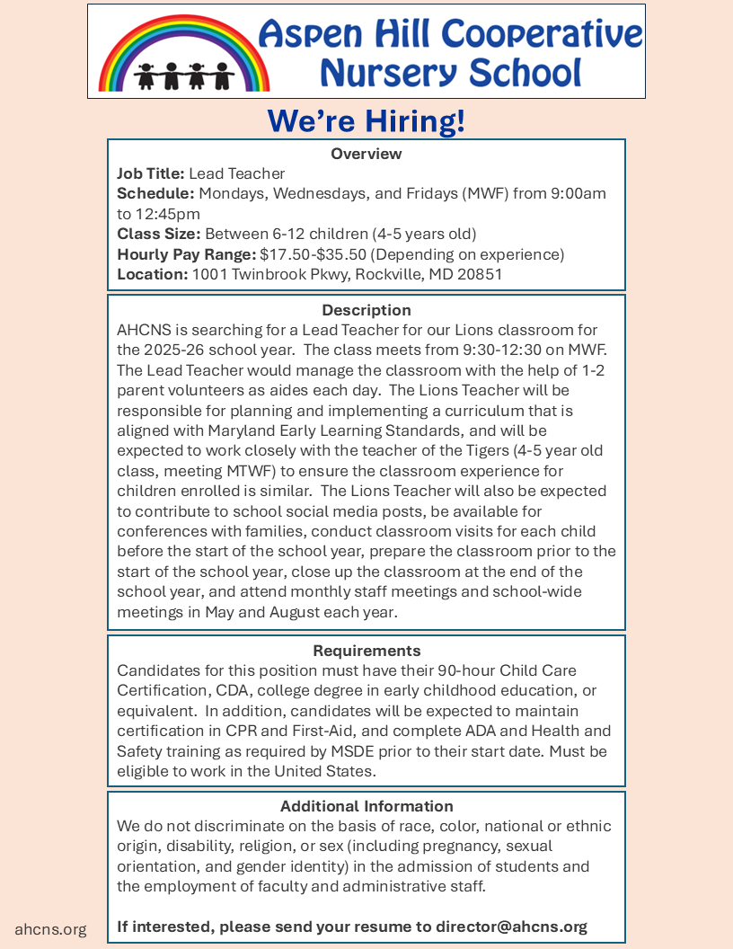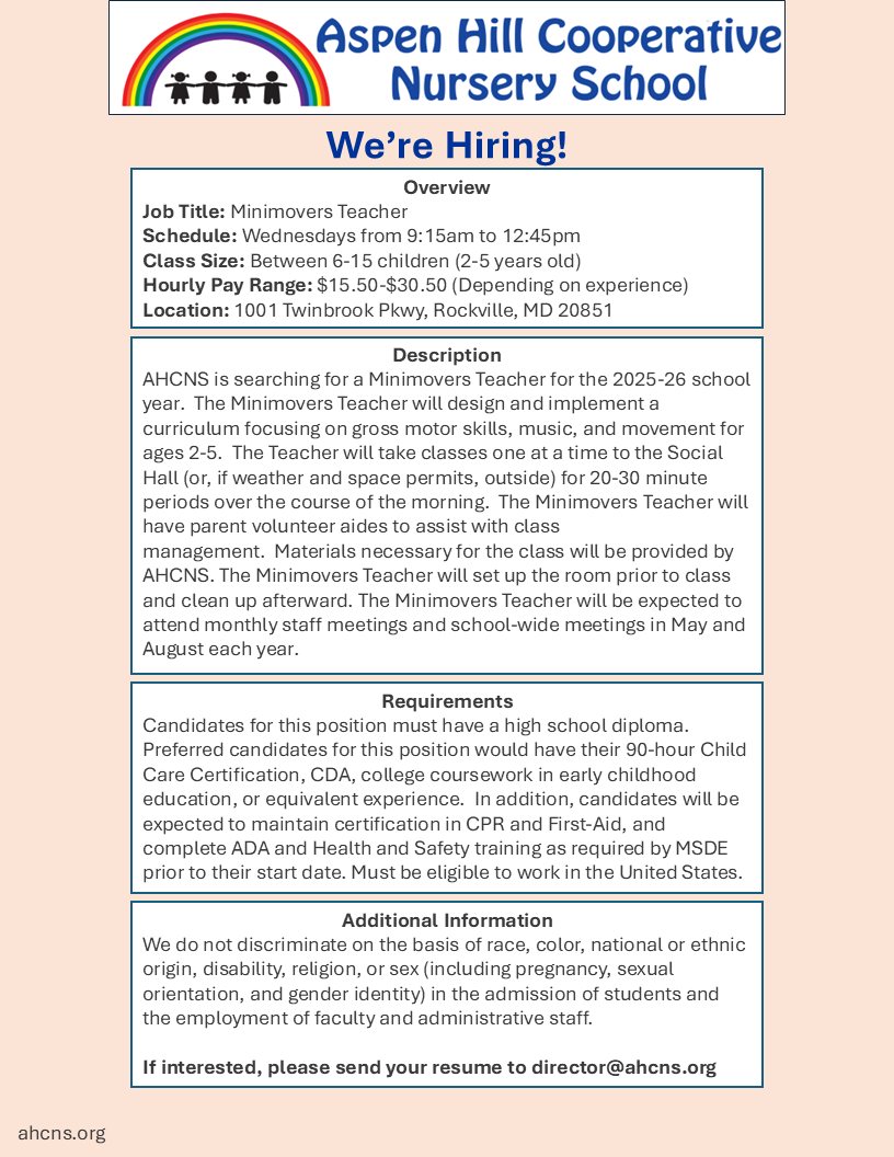 Find out more about our current openings for a Lead Teacher and a MiniMovers Teacher!